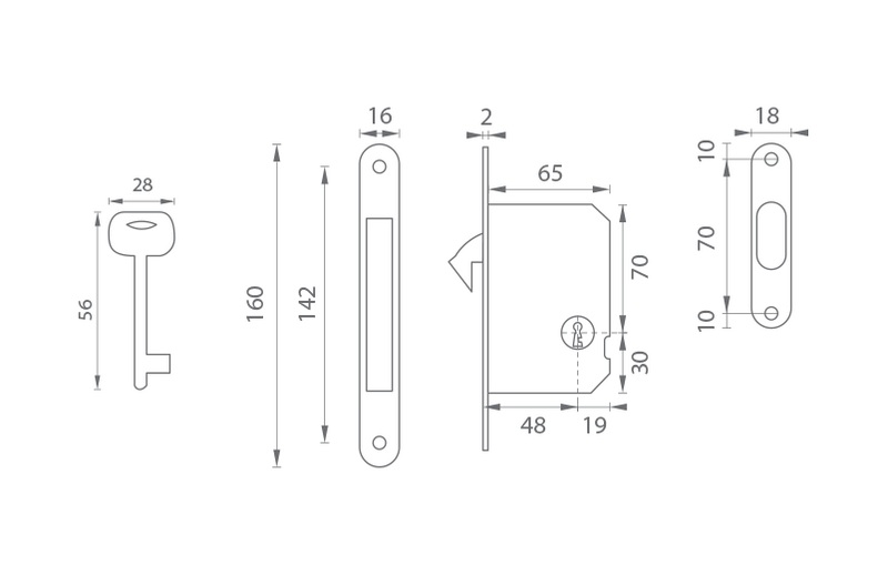 Zámek na posuvné dveře 60/50 BB - zadlabací zámek pro posuvné dveře s otvorem pro pokojový (dózický) klíč