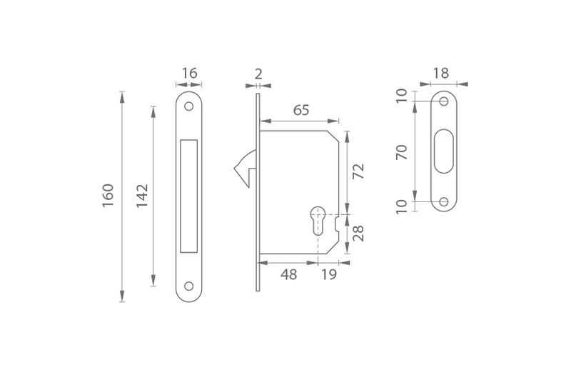 Zámek na posuvné dveře 62/50 PZ - zadlabací zámek pro posuvné dveře s otvorem pro vložkový zámek