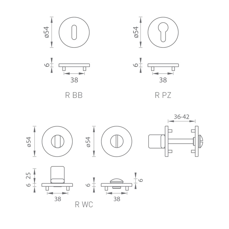 Plochá a minimalistická rozeta pod kliku - ve variantách pro obyčejný klíč, cylindrickou vložku nebo s WC kličkou.