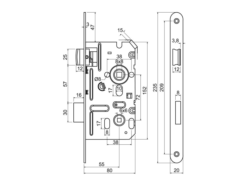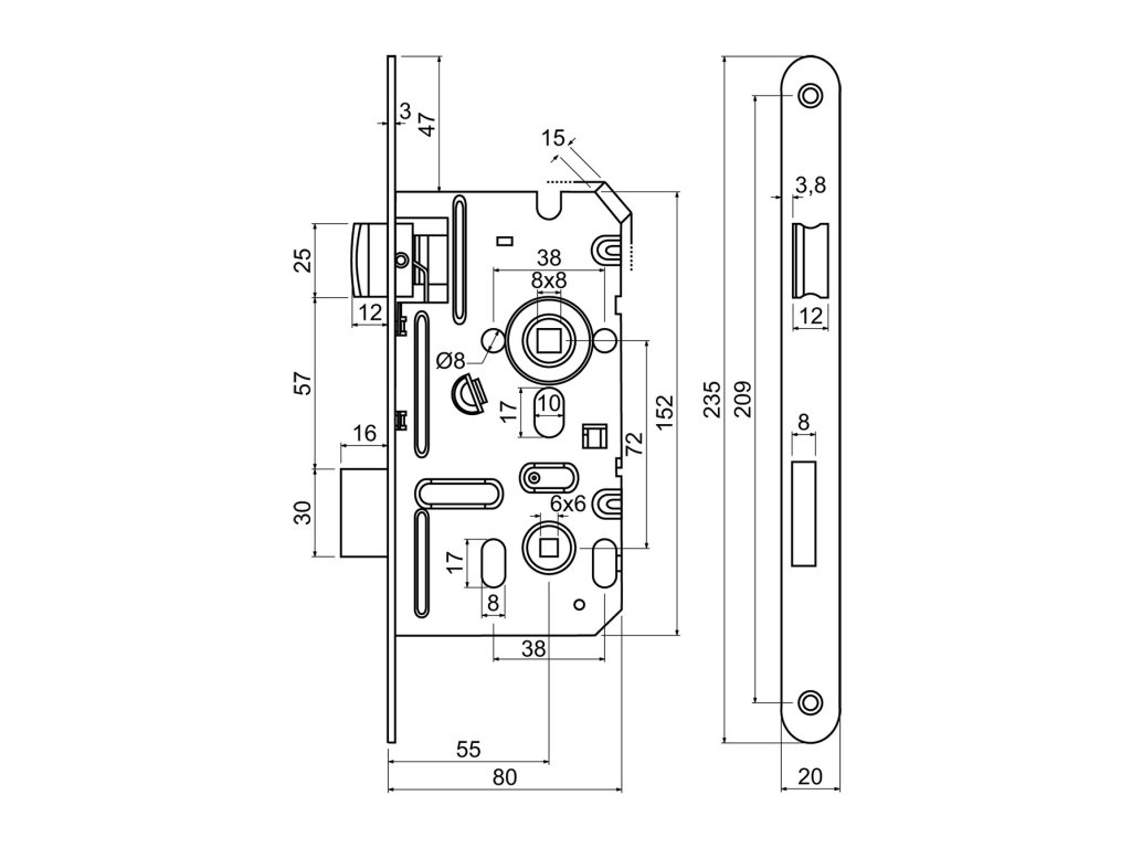 RICHTER zadlabací zámek Z.301-WC.72/55/20 - je klasický zámek pro dřevěné dveře na WC zamykání, možnost výběru pro pravé či levé dveře.