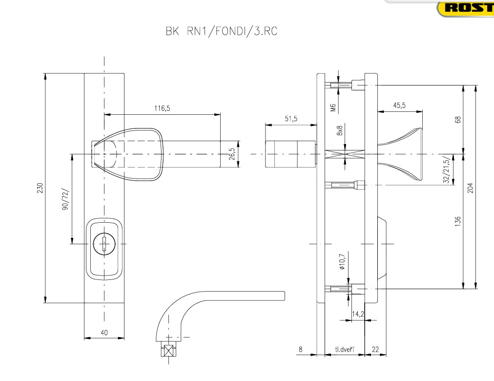 - rozměry: štít 40x230 mm, klika 118mm, rozteč šroubů 204 mm