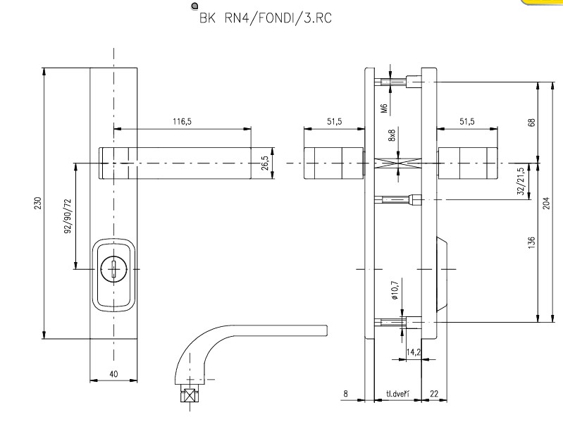 - rozměry: štít 40x230 mm, klika 118mm, rozteč šroubů 204 mm